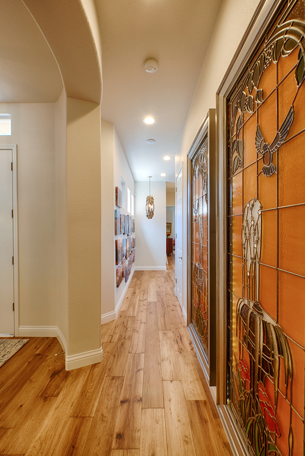 The stained glass windows, designed by Julie's mother and commissioned from local artist Corky Normart, once adorned the front door of Julie's family home.